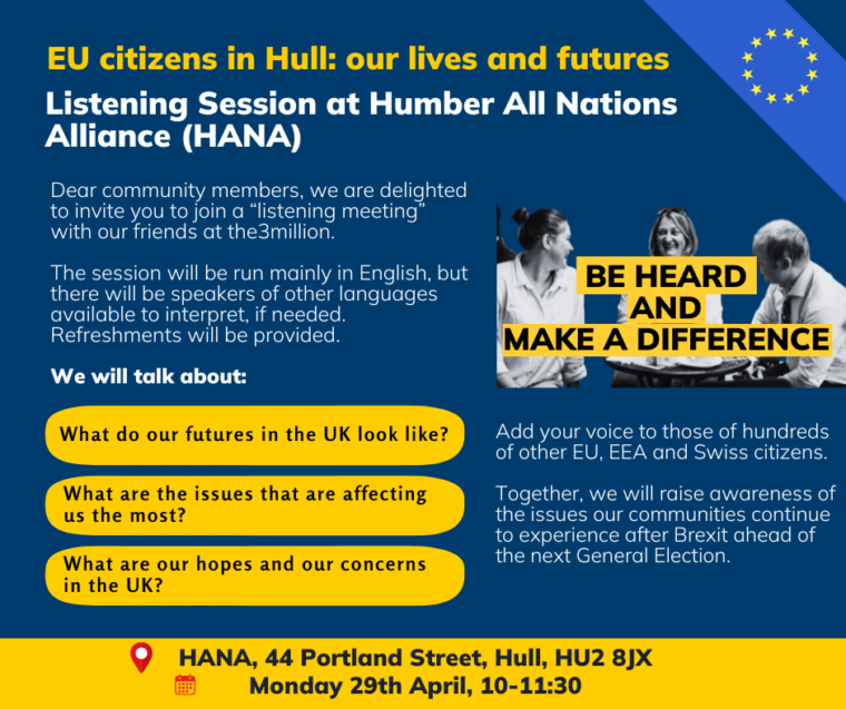EU citizens in Hull: Our Lives and Future Event Details Date: April 29, 2024 10:00 am – 11:30 am Venue: HANA Listening session at Humber All Nations Alliance (HANA) in partnership with the3million